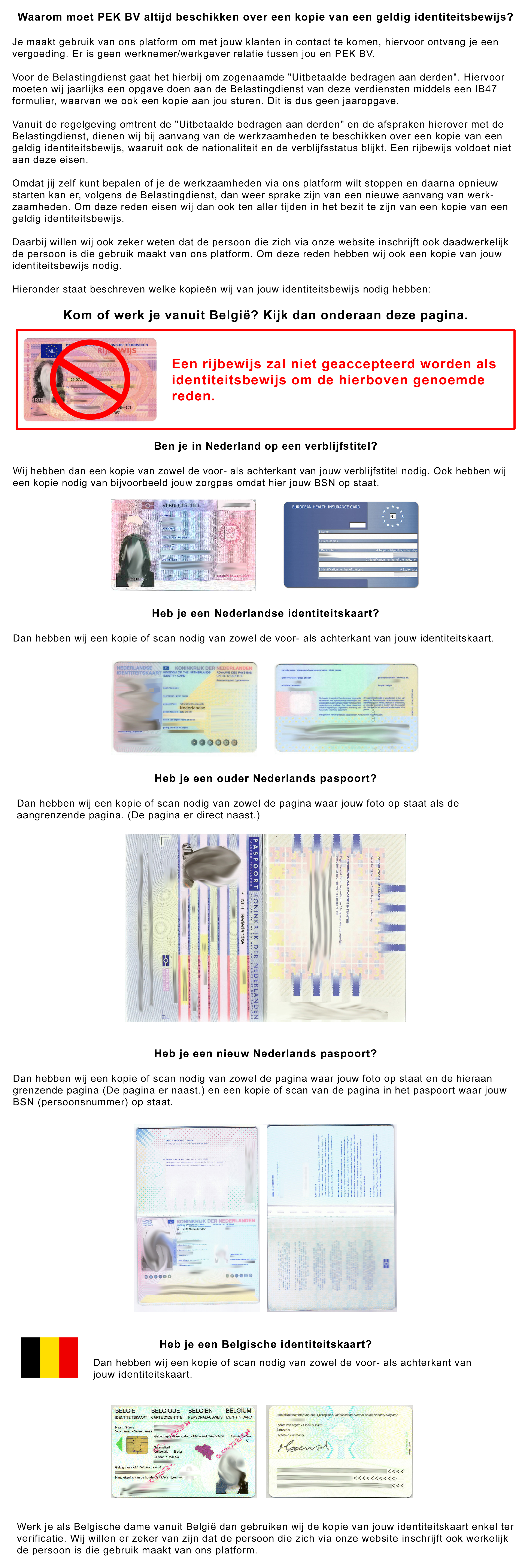 Heb je vragen over dit registratieformulier of over werken via ons platform? Je kunt ons ook telefonisch bereiken op werkdagen tussen 14:00-16:00 uur. Vanuit Nederland bel je met nummer 078-7802340. Vanuit België bel je met nummer 02-3042501. Ook kun je je vragen per e-mail stellen via info@pek.nl.